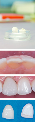 Diese hauchdünnen (ca. 0,5 mm dicken) lichtdurchlässigen Keramikverblendschalen werden nach einem Abdruck in einem aufwändigen Verfahren in unserem Partnerlabor hergestellt und mit einem speziellen Adhäsiv-Verfahren unlösbar auf die Vorderseite der Frontzähne aufgeklebt. Damit wird der Zahn im gesamten sichtbaren Bereich von der Keramik-Facette abgedeckt. Entscheidend für den ästhetischen Erfolg ist die enge Abstimmung zwischen Patient, Zahnarzt und Zahntechniker bezüglich der Farbe und Form des zukünftigen Zahnes. Oft kann der Zahntechniker schon durch ein Wax-up (Wachsaufstellung der gewünschten Zahnform) den zukünftigen Zahn simulieren und der Patient im Mund das zukünftige Ergebnis testen.