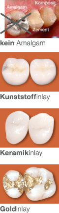 Sollte es dann doch einmal zu einem Zahnschaden gekommen sein, so steht Ihnen in unserer Praxis ein breites Spektrum alternativer Materialien zum Amalgam zur Verfügung. Informieren Sie sich hier näher über Amalgam-Ersatz, zahnfarbene Kunststoff-Füllungen, Gold-Inlays und metallfreie Keramik-Inlays.
